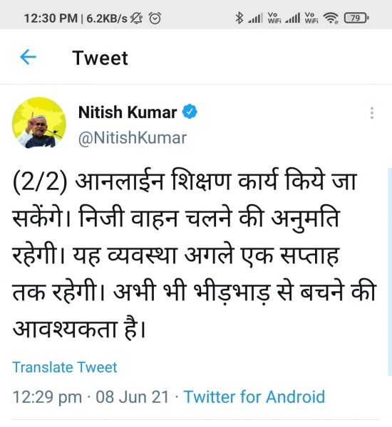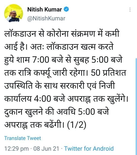 मुख्यमंत्री मुख्यमंत्री नीतीश ने सोशल मीडिया के जरिए यह जानकारी दी है कि 9 जून से बिहार लॉकडाउन की स्थिति से बाहर निकलेगा और अनलॉक की तरफ बढ़ेगा. हालांकि उन्होंने स्पष्ट किया है कि अब भी बहुत एहतियात बरतने की जरूरत है. जिसकी वजह से शाम 7:00 बजे से सुबह 5:00 बजे तक नाइट कर्फ्यू जारी रहेगा. दुकानें सुबह 6:00 से शाम 5:00 बजे तक खुलेंगी, जबकि सरकारी और निजी दफ्तर 50 फ़ीसदी अटेंडेंस के साथ खुल सकेंगे.
