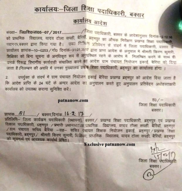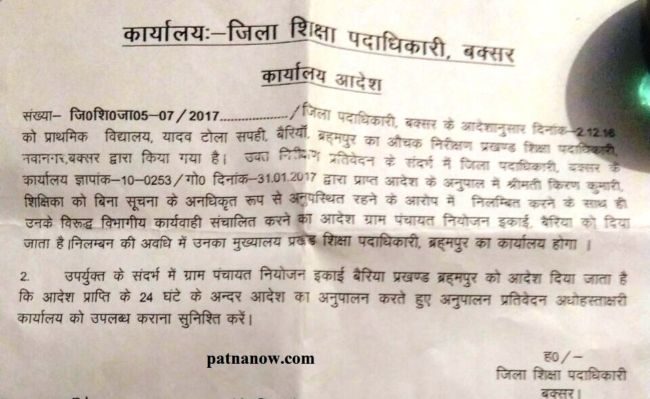 प्राथमिक विद्यालय में यादव टोला सपहीं में 2 दिसंबर को नावानगर के बीईओ ने औचक निरीक्षण किया था. निरीक्षण के दौरान उस विद्यालय में उक्त शिक्षिका किरण कुमारी विद्यालय से नदारद पायी गयीं थी. इसके बाद बीईओ ने अपना निरीक्षण प्रतिवेदन 31 जनवरी को जिला शिक्षा पदाधिकारी को सौप दिया था. उसी के आलोक में जिला शिक्षा पदाधिकारी ने 16 फरवरी को सस्पेंड करते हुए विभागीय कार्रवाई का निर्देश जारी किया है. सबसे दीगर बात यह रही कि उक्त फर्जी शिक्षिका के विषय में बीईओ और डीईओ ने कुछ जानकारी हासिल किये बगैर उसपर विभागीय कार्रवाई की अनुशंसा कर दी. इस दौरान उसका निलंबन अवधि के क्रम में ब्रह्मपुर प्रखंड शिक्षा पदाधिकारी के कार्यालय को ही मुख्यालय भी घोषित कर दिया गया.