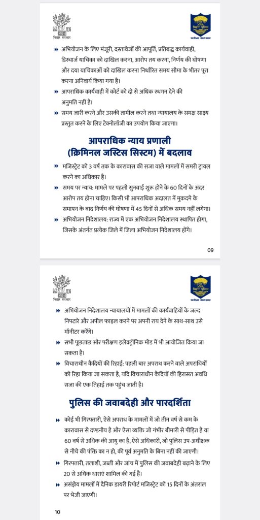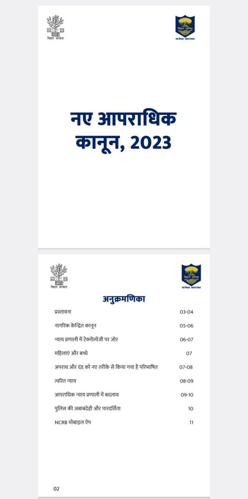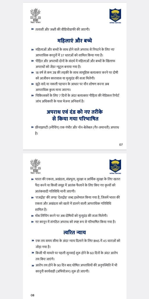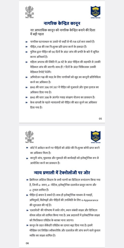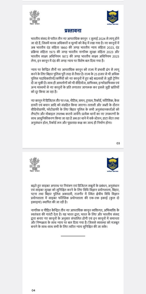 आरा,2 जुलाई. देश में नए आपराधिक कानून को सोमवार से लागू कर दिया गया, जिसे भारतीय संसद से सभी के सहमति से पारित किया गया. देश भर में इस नए कानून को जानने और समझने में लोग लगे हैं. इसी क्रम में इस पर विस्तृत चर्चा के लिए सोमवार को नवादा थाना में आम और प्रबुद्ध लोगों की एक आवश्यक बैठक भोजपुर पुलिस अधीक्षक प्रमोद कुमार की अध्यक्षता में हुई, जिसमें अनेक लोग उपस्थित रहे और नए कानून के बारे में पुलिस अधीक्षक द्वारा विस्तार से चर्चा की गई. महत्वपूर्ण बातें अभी सामने आई कि सारा सिस्टम ऑनलाइन से हो गया है. अब कहीं से भी घटना की जानकारी थाना में दे सकते हैं जिसकी सूचना संबंधित थाना संबंधित स्थान के पदाधिकारी को दे देगा.
