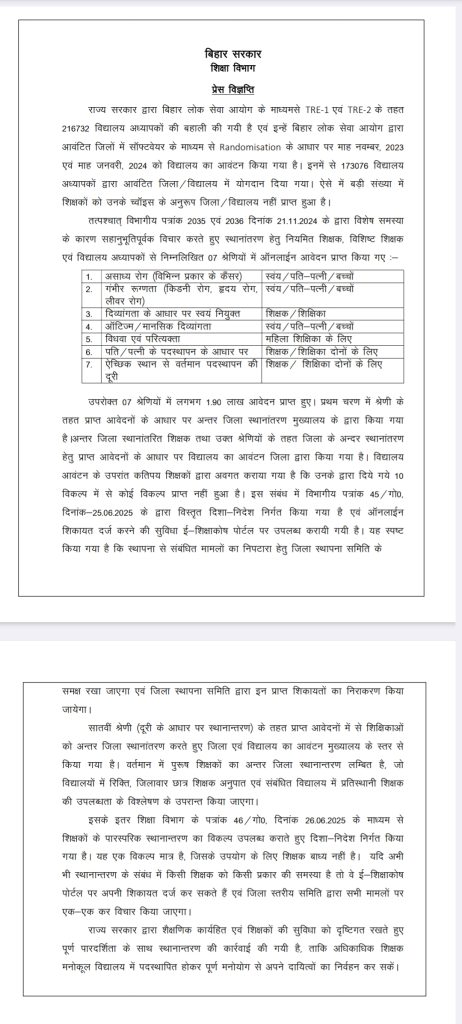 शिक्षा विभाग ने आगे कहा कि उपरोक्त 07 श्रेणियों में लगभग 1.90 लाख आवेदन प्राप्त हुए. प्रथम चरण में श्रेणी के तहत प्राप्त आवेदनों के आधार पर अन्तर जिला स्थानांतरण मुख्यालय के द्वारा किया गया है. अन्तर जिला स्थानांतरित शिक्षक तथा उक्त श्रेणियों के तहत जिला के अन्दर स्थानांतरण हेतु प्राप्त आवेदनों के आधार पर विद्यालय का आवंटन जिला द्वारा किया गया है. विद्यालय आवंटन के उपरांत कतिपय शिक्षकों द्वारा अवगत कराया गया है कि उनके द्वारा दिये गये 10 विकल्प में से कोई विकल्प प्राप्त नहीं हुआ है. इस संबंध में विभागीय पत्रांक 45/गो०, दिनांक-25.06.2025 के द्वारा विस्तृत दिशा-निदेश निर्गत किया गया है एवं ऑनलाईन शिकायत दर्ज करने की सुविधा ई-शिक्षाकोष पोर्टल पर उपलब्ध करायी गयी है. यह स्पष्ट किया गया है कि स्थापना से संबंधित मामलों का निपटारा हेतु जिला स्थापना समिति के समक्ष रखा जाएगा एवं जिला स्थापना समिति द्वारा इन प्राप्त शिकायतों का निराकरण किया जायेगा.