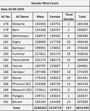 दिनांक 01.07.2025 की अर्हता तिथि के आधार पर निर्वाचक सूची के विशेष गहन पुनरीक्षण अभियान, 2025 (SIR)के तहत पटना जिलान्तर्गत सभी 14 विधान सभा निर्वाचन क्षेत्रों की मतदाता सूची का आज अंतिम प्रकाशन किया गया. इसके अनुसार निर्वाचकों की कुल संख्या 48,15,294 है जो दिनांक 01 अगस्त, 2025 को प्रकाशित प्रारूप सूची में शामिल निर्वाचकों की कुल संख्या 46,51,694 से 1,63,600 अधिक है.