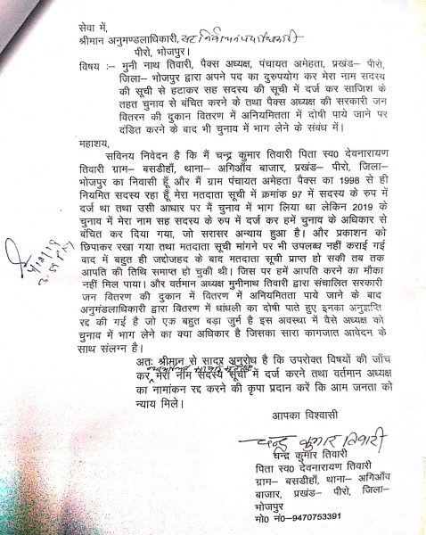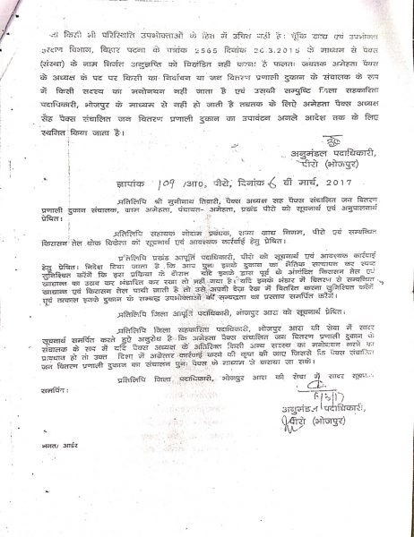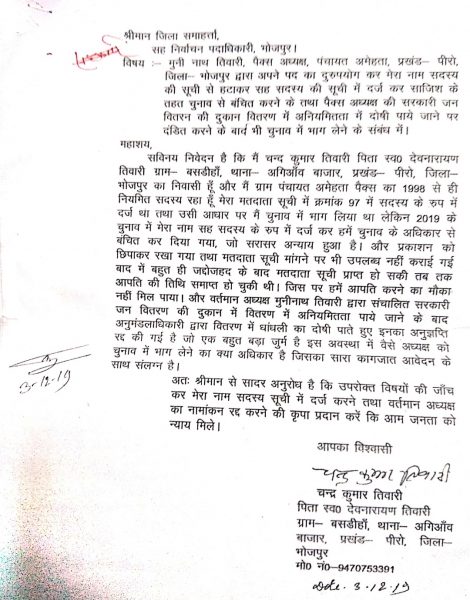 बताते चलें कि मुनिनाथ तिवारी के राशन वितरण दुकान में ग्रामीणों के शिकायत पर भारी अनियमितताएं पाई गयीं थी तो BDO ने खुद जांच कर पैक्स संचालित जन वितरण की दुकान को 6 मार्च 2017 को रद्द कर किया था. BDO ने उसमे लिखा था कि जबतक पैक्स अध्यक्ष के पद पर किसी दूसरे व्यक्ति का मनोनयन नही हो जाता तो अगले आदेश तक उक्त जन वितरण की दुकान को स्थगित किया जाता है. लेकिन 2 वर्ष बाद भी न तो किसी का मनोनयन हुआ और ना ही जन वितरण दुकान बंद. बावजूद इसके सरकारी फाइलों में दर्ज दागी मुनिनाथ तिवारी पैक्स अध्यक्ष के लिए नामांकन भर चुका है लेकिन सदस्य, सह-सदस्य बने एकटक अपनी बेबसी और इस भ्रस्टाचारी सरकारी तँत्र को निहार रहे हैं.