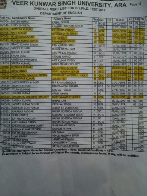 वही, पेपर-2 में अंक सम या विषम किसी में आ सकते हैं कारण कि यह पेपर सब्जेक्टिव है. लेकिन रिजल्ट में गौर करें जिसे पीले रंग से दिखाने की कोशिश भी की गयी है, तो पेपर-1 में कई परीक्षार्थियों के अंक विषम संख्या-31,39,35 आये हैं, जो यह साबित करता है कि विवि प्रशासन के द्वारा गड़बड़ी की गयी. अपने ही नियमो के विरुद्ध नियम बनाने वाला कैसे चला गया? यह बहुत बड़ी गलती है. इसी तरह अन्य विषयों के रिजल्ट में भी गड़बड़ी हुई है. सबसे मजेदार बात तब होगी जब इन हंगामों के ख़त्म होने के बाद अगर अंग्रेजी विषय में किसी का नामांकन पीएचडी में होगा तो एक और जबरदस्त हंगामे का कारण बनेगा. बहरहाल छात्रों के सही हंगामे पर विश्विद्यालय क्या तनाशाही रवैया ही अपनाएगा या फिर अपनी गलती मानते हुए इन सब गोलमाल चीजों को रद्द कर पुनः करने का फरमान सुनाएगा ? ये एक सवाल है. लेकिन छात्र संगठनों की एकजुटता भी हटने के मूड में नहीं है. दिलचस्प टकराव है लेकिन उम्मीद है सत्य की ही विजय होगी.