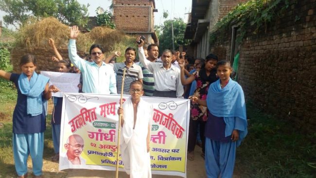 कोइलवर/भोजपुर (अमोद कुमार) | राष्ट्रपिता महात्मा गांधी के 150वीं जयंती के अवसर पर कोईलवर प्रखंड के उत्क्रमित मध्य विद्यालय काजीचक में विभिन्न कार्यक्रमों का आयोजन किया गया. सर्वप्रथम सुबह में स्कूली बच्चों एवं शिक्षकों के द्वारा प्रभातफेरी निकाली गई. बापू के प्रिय भजन “रघुपति राघव राजाराम, पतित पावन सीताराम” का गायन करते हुए बच्चे हाथ में बैनर और स्वच्छता के श्लोगन लिए गांव में घुमते हुए ग्रामवासियों को गांधी जी के विचारों से अवगत कराया.