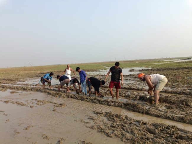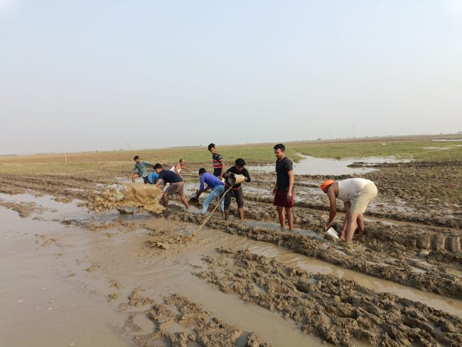 आरा, 29 अक्टूबर. नमामि गंगे नेहरू युवा केंद्र के नागा बाबा युवा क्लब सिन्हा के गंगादूतों ने ग्रामीणों के सहयोग से असंभव कार्य को अपने मेहनत के बल पर संभव किया. सिन्हा से सिन्हा गंगा घाट की दूरी लगभग 3 किलो मीटर है. छठ महापर्व के अवसर पर लगभग इस घाट पर 20,000 से अधिक संख्या में श्रद्धालु इकट्ठा होते हैं और मां गंगा में डुबकी लगाकर आस्था के महान पर्व में भगवान भास्कर को अर्घ्य देते हैं. विगत कुछ दिन पहले गंगा नदी का जल स्तर बढने और पूरे इलाके में पानी आ जाने से गंगा घाट जाने वाले रास्ते में कही-कही घुटने भर पानी भर गया जिससे पूरे रास्ते में दलदल और कीचड़ भरा हुआ था जो आज तक सभी के लिए चिंता का विषय बना हुआ था.