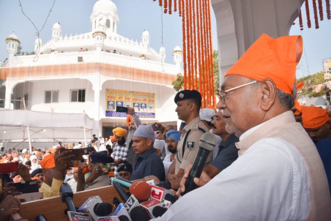 मुख्यमंत्री नीतीश कुमार नालंदा जिला के राजगीर के शीतलकुंड गुरुद्वारा में आयोजित गुरुनानक देव जी महाराज के 554 वें प्रकाश पर्व में शामिल हुए. मुख्यमंत्री ने शीतलकुंड गुरुद्वारा में मत्था टेककर राज्य के सुख-शांति एवं समृद्धि की कामना की. इस अवसर पर मुख्यमंत्री को आयोजकों ने शिरोपा, अंगवस्त्र एवं प्रतीक चिह्न भेंटकर उनका स्वागत किया और मुख्यमंत्री की उपस्थिति एवं उनके सहयोग के लिए उनका आभार भी व्यक्त किया. मुख्यमंत्री ने शीतलकुंड गुरुद्वारा परिसर में नवनिर्मित ‘गुरुनानक निवास’ अतिथिशाला का शिलापट्ट अनावरण कर उद्घाटन किया.