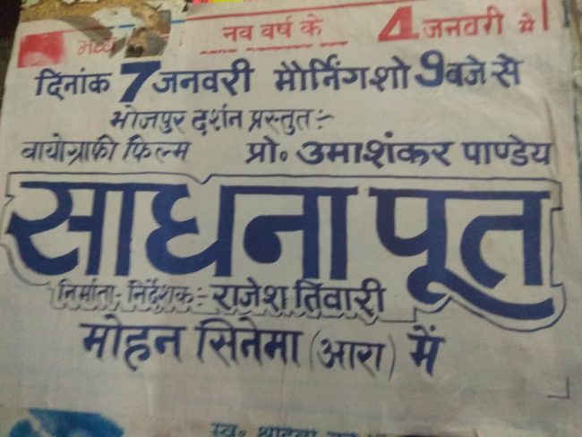 हम बात कर रहे हैं सोमवार को स्थानीय मोहन सिनेमा हॉल में रिलीज की गई फ़िल्म “साधनापूत” की, जिसके प्रीमियम शो में सिनेमाघर दर्शकों से ठसाठस भरा दिखा और दर्शकों ने शानदार लुत्फ उठा फ़िल्म निर्माण से जुड़े लोगों को बधाई दी. बताते चलें कि इस तरह की प्रीमियम शो की शुरुआत अम्बा ने पिछले साल 16 सितम्बर को “ह्यूमन बम” नामक लघु फ़िल्म से मोहन सिनेमा हॉल, आरा से ही की थी. दर्शकों की भारी भीड़ अम्बा की छवि,सत्यकाम आनंद और ओ पी पांडेय जैसे चर्चित नामो की बदौलत इक्कठी हुई थी. फ़िल्म देखने के बाद दर्शको का फ़िल्म मेकरों पर विश्वास और बढ़ा और इस तरह के प्रयोगों में जब “साधनापूत” की खबर दर्शकों तक पहुँची तो हॉल में दर्शकों के बैठने की जगह काम पड़ गयी.