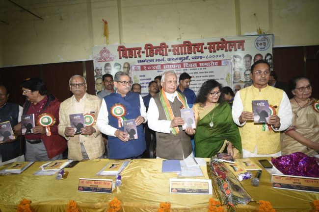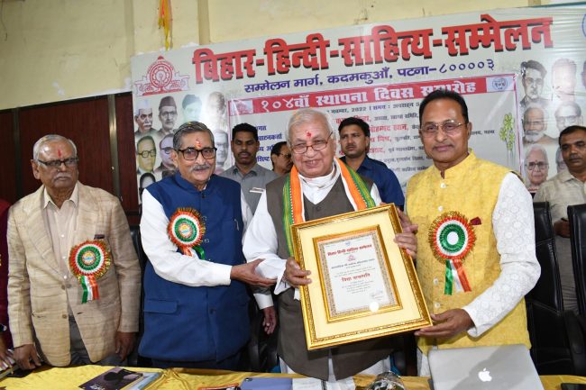 मुख्यअतिथि के रूप में सभा को संबोधित करती हुई चाणक्य राष्ट्रीय विधि विश्वविद्यालय की कुलपति न्यायमूर्ति मृदुला मिश्र ने कहा कि मेरा पूरा परिवार आज से 50 वर्ष पूर्व से साहित्य सम्मेलन से जुड़ा रहा है. अपने अध्यक्षीय संबोधन में सम्मेलन अध्यक्ष डा अनिल सुलभ ने कहा कि सम्मेलन के 104 वर्षों का इतिहास अत्यंत ही गौरवशाली है. हिन्दी भाषा और साहित्य के उन्नयन में सम्मेलन ने देश-व्यापी योगदान दिया है. उन्होंने कि स्वतंत्रता के75 वर्ष के बाद हो जाने के पश्चात भी देश की अपनी कोई राष्ट्रभाषा घोषित नहीं हो सकी और अभी भी औपचारिक रूप से विदेश की एक भाषा भारत की सरकार की कामकाज की भाषा बनी हुई है, जो देश के प्रत्येक नागरिक के लिए वैश्विक-लज्जा का विषय है. उन्होंने महामहिम से आग्रह किया कि वे अपने स्तर से प्रयास करें कि हिन्दी को शीघ्र ही, राष्ट्रीय ध्वज और राष्ट्रीय चिन्ह की भाँति ‘राष्ट्र-भाषा’ घोषित हो.