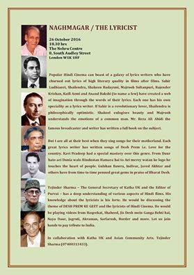 लंदन में कथा यू.के. और एशियन कम्यूनिटी आर्ट्स कार्यक्रम में हिन्दी सिनेमा के देश-प्रेम पर आधारित गीतों को पर्दे पर दिखाया जाएगा. वहां इन गीतों के बारे में प्रकाश डालेंगे प्रसिद्ध साहित्यकार और फिल्म अभिनेता तेजेंद्र शर्मा . इस अवसर पर देश के ख्यातिप्राप्त गीतकार पंडित प्रदीप, शैलेन्द्र, साहिर, शकील, राजेन्द्र कृष्ण, गुलशन बावरा, इंदीवर और आनन्द बख़्शी आदि के लिखे और मुहम्मद रफ़ी, महेन्द्र कपूर, लता मंगेश्कर आदि के गाये गीतों का आन