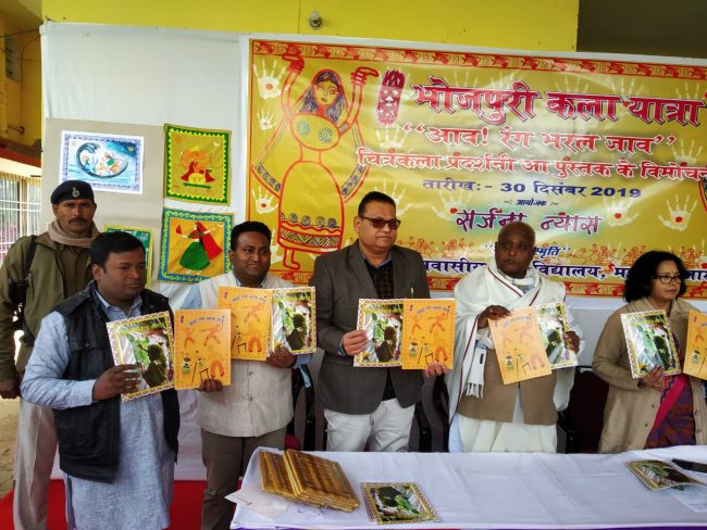 इसके बाद कला संस्कृति मंत्री ने भोजपुरी कला पर आधारित दो पुस्तकों ‘भोजपुरी चित्रकला आ लोकपरम्परा’ और ‘आवs रंग भरल जाव’ का लोकार्पण भी किया जिसे चित्रकार संजीव सिन्हा ने तैयार किया है. विद्यालय के संगीत शिक्षक सरोज सुमन के निर्देशन ने छात्राओं ने भोजपुरी मंगलाचरण और भिखारी ठाकुर द्वारा रचे गीतों की प्रस्तुति दी. अपने सम्बोधन में डॉ नीरज सिंह ने भोजपुरी की सांस्कृतिक परम्परा और इसके भौगोलिक विस्तार की चर्चा की तथा बच्चों द्वारा किये गए कार्यों की मुक्त कंठ से सराहना की. पत्रकार और भोजपुरी कवि बृजम पांडेय ने भोजपुरी कविता प्रस्तुति की. जे पी विश्वविद्यालय के पूर्व प्राध्यापक प्रो पी राज सिंह ने सर्जना ट्रस्ट द्वारा भोजपुरी चित्रकला को संरक्षित करने की दिशा में उठाये जा रहे प्रयासों को और अधिक क्षेत्रों में विस्तार करने की आवश्यकता जताई.