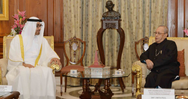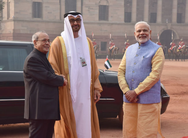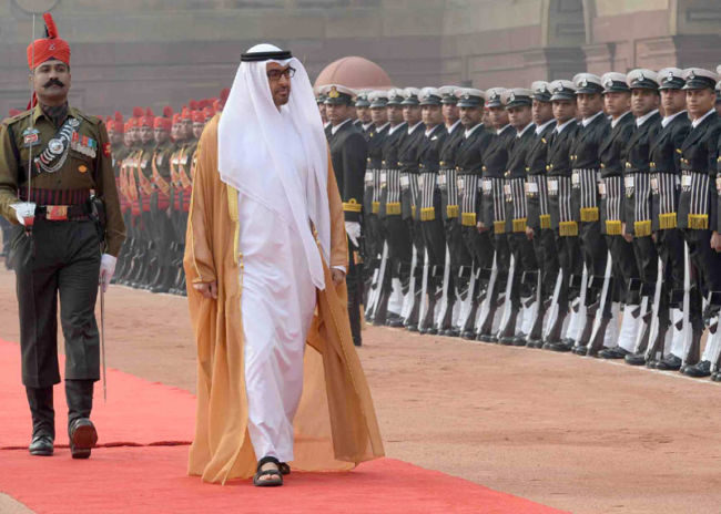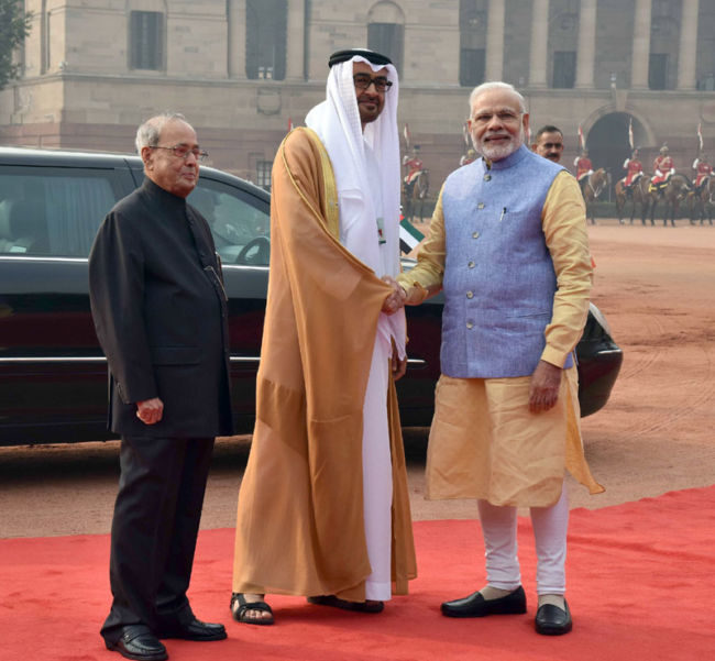 The Crown Prince of Abu Dhabi, Deputy Supreme Commander of U.A.E. Armed Forces, General Sheikh Mohammed Bin Zayed Al Nahyan being received by the President, Shri Pranab Mukherjee and the Prime Minister, Shri Narendra Modi, at the ceremonial reception, at Rashtrapati Bhavan, in New Delhi on January 25, 2017.The Crown Prince of Abu Dhabi, Deputy Supreme Commander of U.A.E. Armed Forces, General Sheikh Mohammed Bin Zayed Al Nahyan inspecting the Gourd of Honour, at the ceremonial reception, at Rashtrapati Bhavan, in New Delhi on January 25, 2017.The Prime Minister, Shri Narendra Modi with the Crown Prince of Abu Dhabi, Deputy Supreme Commander of U.A.E. Armed Forces, General Sheikh Mohammed Bin Zayed Al Nahyan, at Hyderabad House, in New Delhi on January 25, 2017.The Prime Minister, Shri Narendra Modi with the Crown Prince of Abu Dhabi, Deputy Supreme Commander of U.A.E. Armed Forces, General Sheikh Mohammed Bin Zayed Al Nahyan, at Hyderabad House, in New Delhi on January 25, 2017.The Prime Minister, Shri Narendra Modi and the Crown Prince of Abu Dhabi, Deputy Supreme Commander of U.A.E. Armed Forces, General Sheikh Mohammed Bin Zayed Al Nahyan at the joint media briefing, at Hyderabad House, in New Delhi on January 25, 2017.The Prime Minister, Shri Narendra Modi and the Crown Prince of Abu Dhabi, Deputy Supreme Commander of U.A.E. Armed Forces, General Sheikh Mohammed Bin Zayed Al Nahyan at the joint media briefing, at Hyderabad House, in New Delhi on January 25, 2017.The Crown Prince of Abu Dhabi, Deputy Supreme Commander of U.A.E. Armed Forces, General Sheikh Mohammed Bin Zayed Al Nahyan signing the visitors’ book, at Hyderabad House, in New Delhi on January 25, 2017. The Prime Minister, Shri Narendra Modi is also seen.The Vice President, Shri M. Hamid Ansari meeting the Crown Prince of Abu Dhabi, Deputy Supreme Commander of U.A.E. Armed Forces, General Sheikh Mohammed Bin Zayed Al Nahyan, in New Delhi on January 25, 2017.The Crown Prince of Abu Dhabi, Deputy Supreme Commander of U.A.E. Armed Forces, General Sheikh Mohammed Bin Zayed Al Nahyan meeting the President, Shri Pranab Mukherjee, at Rashtrapati Bhavan, in New Delhi on January 25, 2017.