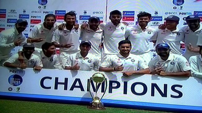 बता दें कि श्रीलंका, दक्षिण अफ्रीका, वेस्टइंडीज न्यूजीलैंड, इंग्लैंड और बांग्लादेश के बाद अब ऑस्ट्रेलिया के खिलाफ ये लगातार सातवीं टेस्ट सीरीज जीत भारत ने हासिल की है.