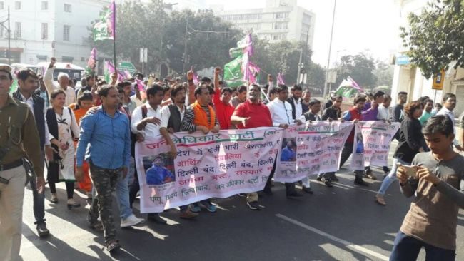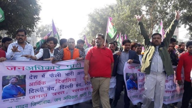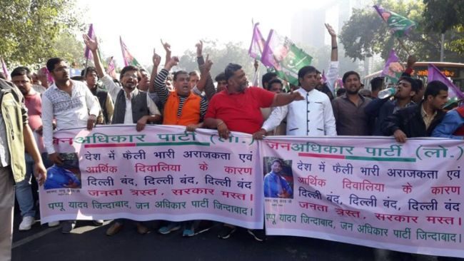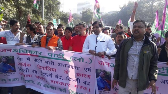नोटबंदी के खिलाफ आज भारत बंद को लेकर जन अधिकार पार्टी लो.ने पप्पू यादव के नेतृत्व में विरोध प्रदर्शन किया .इस अवसर पर कई कार्यकर्ताओं ने इस विरोध प्रदर्शन में भाग लिया .