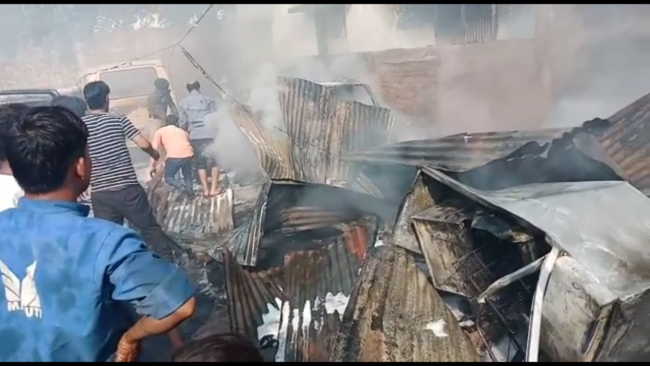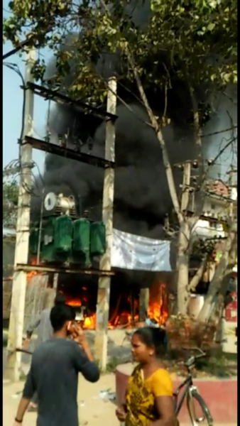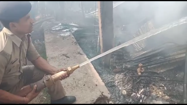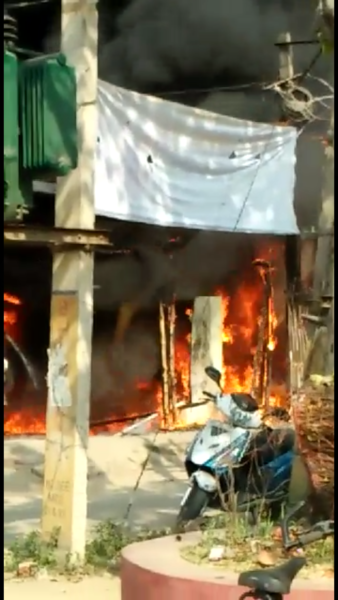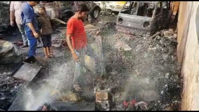 यूँ जला गैरेज और आग बुझाने में जुटी पुलिस व स्थानीय लोग