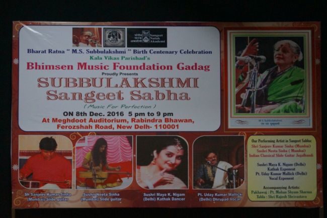 कलाविकास परिषद अंतर्गत भीमसेन म्युजिक फाउंडेेशन द्वारा सुब्बुलक्ष्मी संगीत सभा का आयोजन दिल्ली संगीत नाटक अकादमी के मेघदूत ऑडिटोरियम में किया गया .दर्शकों एवं श्रोताओं से खचाखच भरे ऑडिटोरियम में संगीत संध्या का प्रारंभ दिल्ली की माया निगम के शानदार कत्थक नृत्य से हुई . तत्पश्चात् मुंबई से आए पटना निवासी नीता सिन्हा एवं संजीव कुमार के बीच इंडियन स्लाइड गिटार की जुगलबंदी हुई, जिसमें रूद्र ताल एवं दुुत तीन ताल में राग लतांगी को श्रोता व दर्शक सदा याद रखेंगे.इस युगलबंदी में दोनों कलाकारों ने अपने वादन से लोगों को झुमने पर मजबूर कर दिया . कार्यक्रम का समापन दिल्ली के पंडित उदय कुमार मल्लिक के ध्रुपद गायन से हुआ. तबले पर संगत देते हुए दिल्ली के राजेश श्रीवास्तव एवंं पखाावज पर संगत की पंडित मोहन श्याम शर्मा ने लोगों को मंत्रमुग्ध कर दिया.