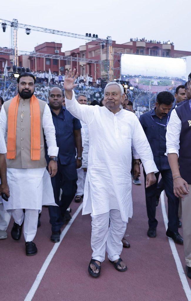 मुख्यमंत्री ने कार्यक्रम की शुरूआत के पूर्व पाटलिपुत्र स्पोर्ट्स मैदान में घूमकर सभी अतिथियों एवं खिलाड़ियों का हाथ हिलाकर अभिवादन स्वीकार किया.