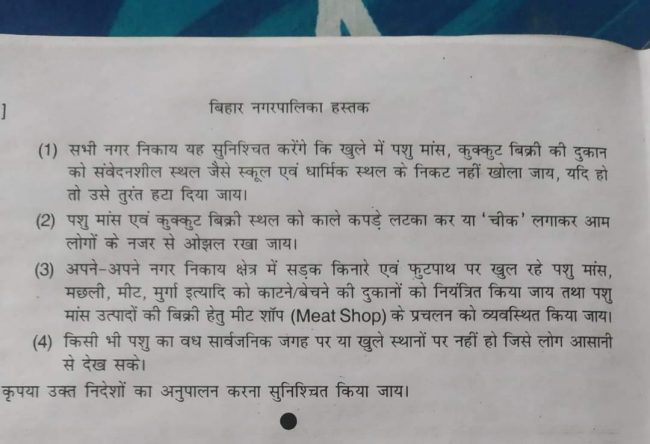 (2) पशु मांस एवं कुक्कुट बिक्री स्थल को काले कपड़े लटका कर या ‘चीक’ लगाकर आम लोगों के नजर से ओझल रखा जाय.