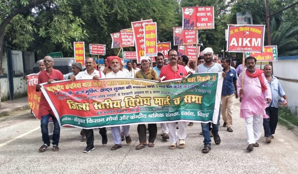 मार्च से पहले पोलो ग्राउंड में हुई सभा में एम एस पी की गारंटी, कर्ज मुक्ति, खादय सुरक्षा की गारंटी, बहुराष्ट्रीय कपनियों को इंडिया से बाहर करने और डब्लूटीओ से बाहर निकलने पर नेताओं ने जोर दिया. किसान सभा के जिला सचिव राजीव कुमार चौधरी ने कहा कि चार श्रम कोड को रद्द करना नितांत आवश्यक है. संयुक्त किसान मोर्चा और श्रमिक संगठन के दरभंगा इकाई के बैनर तले हुए इस आयोजन के दौरान किसान सभा के जिला सचिव राजीव चौधरी, अखिल भारतीय किसान महासभा के जिला सचिव धर्मेश यादव और दरभंगा किसान कॉन्सिल के जिला अध्यक्ष महेश दूबे की संयुक्त अध्यक्षता में नेताओं ने केंद्र सरकार के खिलाफ आक्रोश व्यक्त किया. सभा को अखिल भारतीय किसान सभा के राज्य उपाध्यक्ष ललन चौधरी, अविनाश कुमार ठाकुर, सयुंक्त सचिव श्याम भारती, किसान सभा के राज्य अध्यक्ष रामकुमार चौधरी, पूर्व जिला सचिव नारायणजी झा, अली अहमद तम्मने, किसान महासभा के बैद्यनाथ यादव, राज्य सह सचिव अभिषेक कुमार, शिवन यादव, रोहित कुमार, केशरी यादव, प्रवीण यादव, खेग्रामस के जिला सचिव पप्पू पासवान, हरि पासवान, देवेंद्र कुमार, जमालुद्दीन, एक्टू के जिला सचिव उमेश प्रसाद साह, जिला अध्यक्ष रामनारायण पासवान, सुरेंद्र पासवान, नीलम देवी, हीरा साफी, सुरेंद्र यादव, खेत मजदूर यूनियन के दिलीप भगत, गोपाल चौधरी, गणेश महतो, सुशीला देवी, विद्या देवी, सफाई मजदूर नेता दिनेश झा, गोपाल ठाकुर, शैलेन्द्र ठाकुर, गंगा राम साह, खेत मजदूर यूनियन के पूर्व जिला सचिव चंदेश्वर प्रसाद सिंह, विश्वनाथ मिश्र आदि ने सम्बोधित किया.