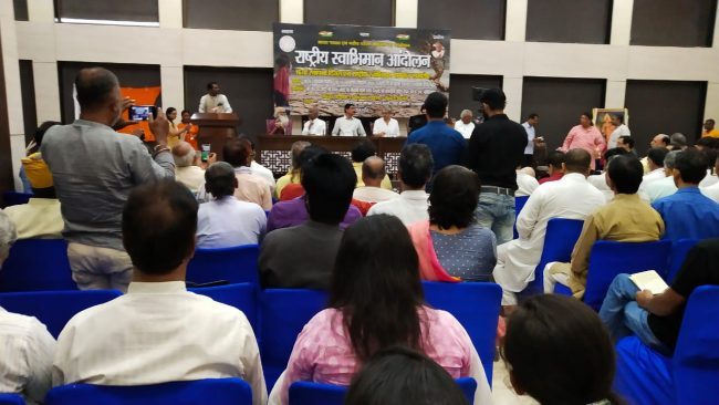 वहीं अपने संबोधन में गोबिन्दाचार्य ने कहा कि देश के विकास के बारे में सोचेंगे तो दुनियां से अलग होकर सोचा नहीं जा सकता. दुनियां में 500 वर्षों में कोई बदलाव नहीं आया. उससे ज्यादा गति से पचास वर्षों में बदलाव आए हैं. उन्होंने इको सेंट्रिक डेवेलपमेंट की चर्चा की. कहा कि जल, जीवन, जंगल, जमीन और जन का अनुकूल जीवन विकास करने पर बल दिया. फिलॉसफी जीव, जगत जगदीश के मूल सिद्धांत के साथ विश्व का विकास किया जाना चाहिए. उन्होंने कहा कि राष्ट्रीय स्वाभिमान आंदोलन जमीन, जंगल जानवर व जल के मुद्दे पर कार्य करे. विकास की कल्पना ऐसी हो कि हर बच्चे को प्रतिदिन आधा किलो हरी सब्जी आधा किलो दूध और आधा किलो फल मिले, तब तो विकास है. जमीन की उत्पादन क्षमता बढ़ी, जलस्तर बढ़ा, वनाच्छाजन बढ़े तब विकास है. नहीं तो किसी भी विकास के कोई मायने नहीं है और इसी विकास के लिए राष्ट्रीय स्वाभिमान आंदोलन प्रयासरत रहेगा.