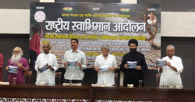 दिल्ली, 17सितंबर. व्यवस्था परिवर्तन व प्रकृति केंद्रित विकास को समर्पित संस्था राष्ट्रीय स्वाभिमान आंदोलन का 16 वां स्थापना दिवस नई दिल्ली में रफी मार्ग स्थित कॉन्स्टिट्यूशन क्लब स्पीकर हॉल में मनाया गया. इस अवसर पर आयोजित समारोह में विभिन्न क्षेत्र के दो सक्रिय सज्जनों को राष्ट्रीय स्वाभिमान सम्मान से सम्मानित किया गया. कार्यक्रम की अध्यक्षता संस्था के संस्थापक गोबिन्दाचार्य ने किया. वहीं कार्यक्रम संचालन राष्ट्रीय संयोजक पवन श्रीवास्तव ने किया. मुख्य अतिथियों में पोपटराव पवार, मयंक गांधी, मौलाना कल्बे रुशैद रिजवी, बसव राज पाटिल शेडम थे. कार्यक्रम की शुरुआत आगत अतिथियों ने भारत माता की आरती व पुष्पार्पण से हुआ. अतिथियों को सुत माला देकर स्वागत किया गया. इसके बाद कर्नाटक से आये पर्यावरण नायक एस बालाकृष्णन व बिहार के कवि गंगायात्री निलय उपाध्याय को राष्ट्रीय स्वाभिमान सम्मान से नवाजा गया. निलय उपाध्याय बक्सर जिले के सिमरी प्रखंड अंतर्गत दुल्लहपुर गांव के निवासी हैं. उन्होंने सात वर्षों से लगातार गंगोत्री से गंगासागर तक यात्राएं की हैं. वे इसके पहले बनारसी प्रसाद आजाद सम्मान से भी सम्मानित हो चुके हैं.