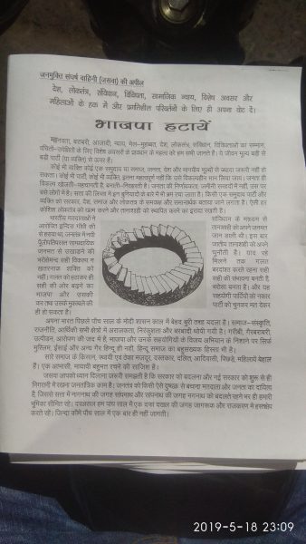 मध्यरात्रि के समय गोला मुहल्ले के पास खड़े युवकों ने जब पर्चे लेने से इनकार करते हुए इसे चुनाव आचार संहिता का उलंघन बताया तो ‘जसवा’ के कार्यकर्ता ने यह कहते हुए पर्चा थमा दिया कि आपको जो मन करे इस पर्चे के साथ कीजिये. मेरा काम है पर्चा बाँटना अब आप इसे पढ़िए या फेंक दीजिये.
