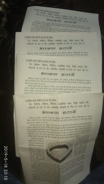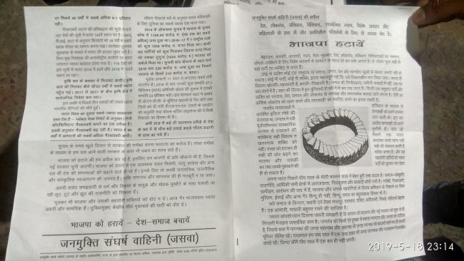 आरा,18 मई. 19 मई 2019 को होने वाले लोकसभा चुनाव को लेकर जहां 24 घण्टे पहले सभी पार्टियों का चुनाव-प्रचार थम चुका है वैसे में आरा में आज रात लगभग 11 बजे रात में चुनाव से महज 8 घण्टे पूर्व जसवा(जनमुक्ति संघर्ष वाहिनी) के कार्यकर्ता को एक पार्टी विशेष के विरोध में पर्चे बांटते देखा गया. चुनाव में कड़े नियमों और सख्ती के बाद भी यह दुःसाहस भरा कार्य कानून के विरोध है. वोटरों को रातों रात अपने पक्ष में मोड़ने के उद्देश्य से ऐसे कार्य किये जाते है. अब दिलचस्प सवाल यह कि जनमुक्ति संघर्ष वाहिनी किसी पार्टी विशेष का विरोध खुद कर रही है या किसी के कहने पर?