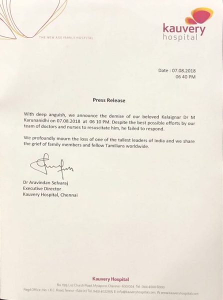 अस्पताल के कार्यकारी निदेशक डॉक्टर अरविन्दन सेल्वाराज की ओर से जारी विज्ञप्ति के अनुसार, ‘हमें बड़े दुख के साथ बताना पड़ रहा है कि हमारे प्रिय कलैंग्नर एम. करुणानिधि का सात अगस्त, 2018 को शाम छह बजकर दस मिनट पर निधन हो गया. डॉक्टरों और नर्सों की हमारी टीम के सर्वश्रेष्ठ प्रयासों के बावजूद उन्हें बचाया नहीं जा सका.’ विज्ञप्ति के अनुसार, ‘हम भारत के कद्दावर नेताओं में से एक के निधन पर गहरा शोक व्यक्त करते हैं और परिवार के सदस्यों तथा दुनिया भर में बसे तमिलवासियों का दुख साझा करते हैं.‘