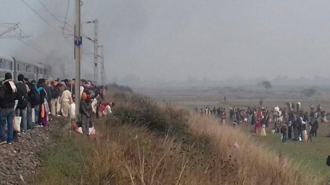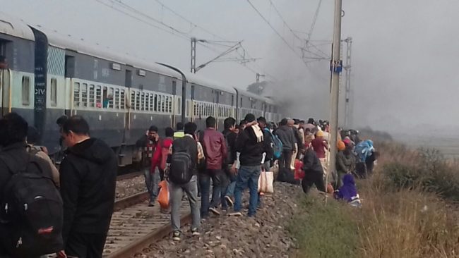 इंजन में लगी आग को दूर से देखते यात्री