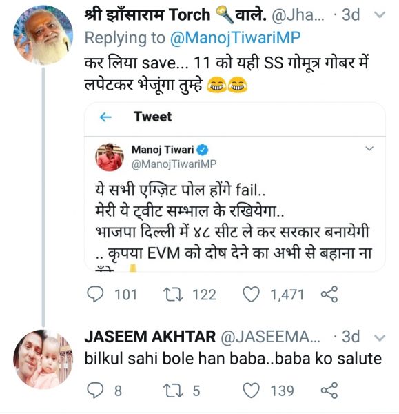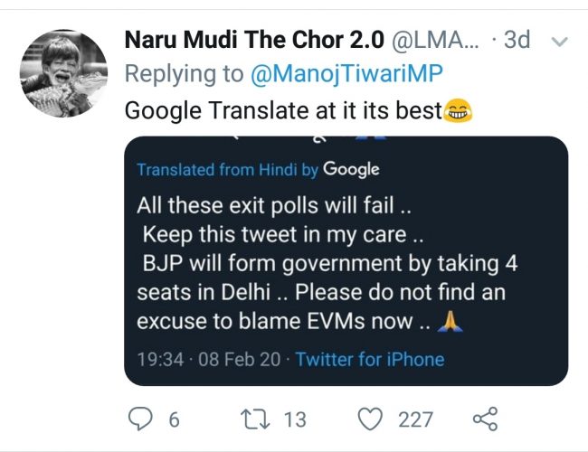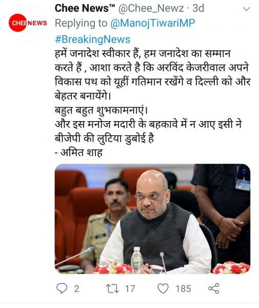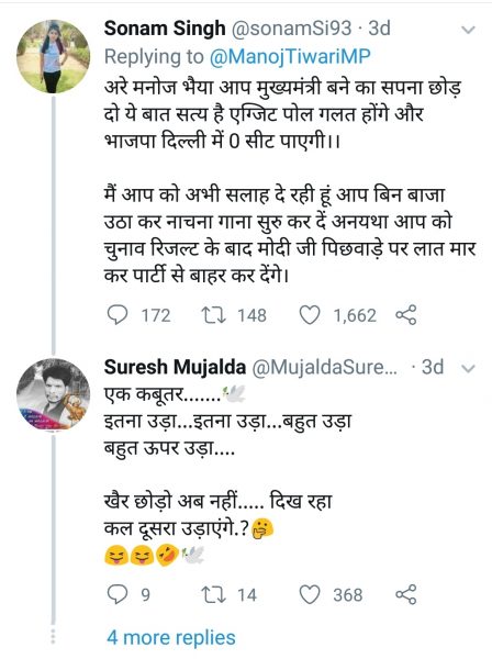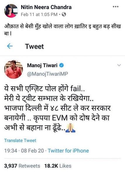 प्रेसिडेंट अवार्ड विनर निर्देशक नितिन चन्द्रा ने भी ट्वीट को साझा कर लिखा है कि औकात से ज्यादा बोलने वालों के लिए यह एक सीख है. बताते चलें मनोज तिवारी पिछले 6 सालों से भोजपुरी को 8वी अनुसूची में शामिल होने का दावा करते आ रहे हैं लेकिन पिछले 6 सालों से उनका एक साल पूरा नही हुआ है. भोजपुरी को 8वी अनुसूचि में शामिल करना तो दूर इसे स्कूल के पाठ्यक्रमों में शामिल नही किया है जबकि दिल्ली में मात्र 14 प्रतिशत बिहारियों के लिए केजरीवाल सरकार ने स्कूलों में भोजपुरी को ऐच्छिक विषय के रूप में लागू कर दिया है.