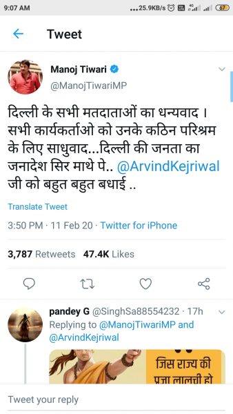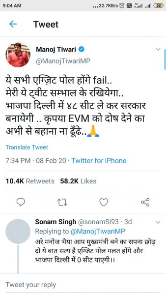 पटना,12 फरवरी. दिल्ली विधानसभा के चुनाव नतीजों के बाद केजरीवाल की पार्टी से पटखनी खाये BJP की हार के बाद दिल्ली BJP अध्यक्ष मनोज तिवारी का बुरा हाल है. चुनाव से पहले 48 सीट लाने का दावा करने वाले और अपने ट्वीट को सेव कर रखने के लिए जनता से कहने वाले सांसद व दिल्ली BJP अध्यक्ष मनोज तिवारी को ट्वीटर पर जनता ने ट्रोल कर दिया है. पहले से ही जीत का दम्भ भरने वाले अपने अनुमानित सीटों की एक चौथाई सीट लाने में नाकाम BJP अध्यक्ष को अपने बड़बोलेपन के कारण मुंह की खानी पड़ी है. फेसबुक से लेकर ट्वीटर और वाट्सएप पर लोग मनोज तिवारी के ट्वीट को साझा कर मजे ले रहे हैं. मजेदार बात यह है कि जिस अध्यक्ष ने 48 सीटों को पाने का दावा किया था उन्होंने कल aap की जीत के बाद ट्वीटर पर आप और केजरीवाल को बधाई दी है.