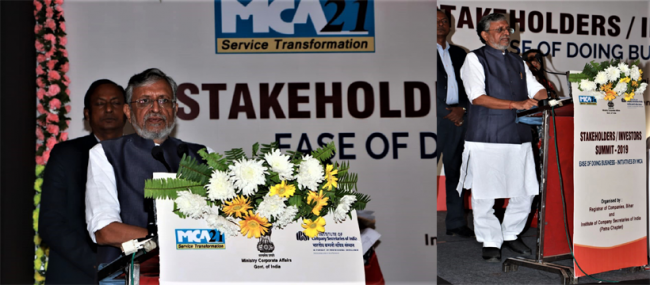 इसके उपरांत सुशील मोदी, उपमुख्यमंत्री ने अपना सम्बोधन करते हुए सबसे पहले मंत्रालय तथा भारतीय कंपनी सचिव संस्थान को इस आयोजन के लिये धन्यवाद देते हुए अपना मत रखा. उन्होंने कहा कि देश ने ईज ऑफ डूइंग बिजनेस के क्षेत्र में लंबी छलांग भरी है. वर्ष 2014 में भारत 142वें स्थान पर था. 2019 में 63वें पायदान पर आ गया है. कहा कि प्रधानमंत्री की इच्छा है कि भारत दुनियां के उन 50 देशों में शामिल हो, जहां व्यापार करना सबसे आसान है. कहा कि नोटबंदी का वही लोग विरोध करते हैं, जिनके अवैध कारोबार प्रभावित हुए. कहा कि नोटबंदी के बाद 2017-18 और 2018-19 में कुल 3.28 लाख कंपनियों का पंजीकरण रद्द हुआ. उन्होंने कहा कि एक कमरे में 10-10 कंपनियां चल रही थीं. कहा कि नोटबंदी के बाद यदि बाजार में नकदी कम हुई है तो डिजिटल लेनदेन में काफी इजाफा हुआ है. फर्जी जीएसटी पंजीकरण कराने वालों पर कसा शिकंजामोदी ने कहा कि जीएसटी के तहत ढाई साल में 2.72 लाख पंजीकरण हुए. तमाम लोग फर्जी रजिस्ट्रेशन कराकर व्यापार कर रहे थे. ऐसे 98 लोगों के खिलाफ वाणिज्य कर विभाग ने कार्रवाई की है. नौ लोगों पर एफआईआर की गई है. कहा कि जीएसटी में जियो टैगिंग होने जा रहे है. कहा कि 90 हजार 639 लोगों ने छह माह से रिटर्न फाइल नहीं किया. जांच के बाद सात हजार 368 लोगों के पंजीकरण रद्द किए गए हैं. देश और बिहार में ऐसा ही हो रहा है. एडिशनल सॉलिसिटर जनरल ऑफ इंडिया एस डी संजय, परिवहन सचिव सह आयुक्त पटना प्रमंडल संजय अग्रवाल, बिहार चेंबर ऑफ कॉमर्स के अध्यक्ष पीके अग्रवाल, रीजनल डायरेक्टर कॉरपोरेट मंत्रालय डी. बंधोपाध्याय ने विचार रखे. कार्यक्रम में धन्यवाद ज्ञापन हिमांशु शेखर, रजिस्ट्रार ऑफ़ कम्पनीज, बिहार ने किया. सम्मेलन में लगभग 200 कंपनी सचिव, चाटर्ड अकाउंटेंट, तथा उधोगपति शमिल हुए.