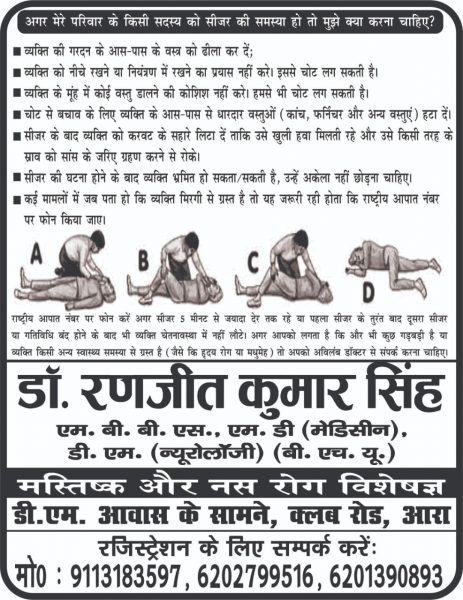 रविवार को बड़हरा क्षेत्र के सरैयां(मठिया पर) निःशुल्क चिकित्सा कैम्प लगाया गया जहाँ 120 मरीजों का इलाज किया गया जिसमें 40 लकवा और 20 मिर्गी के मरीज थे. क्षेत्र में लगभग 25 हजार पर्चे भी बांटे गए जिसमे रोग के लक्षण और उसके प्राथमिक उपचार की विधि लिखी हुई थी. इस चिकित्सा कैम्प में लगभग 600 लोग उपस्थित हुए जिनके बीच उक्त रोगों से सम्बंधित उपायों और बचाव की जानकारियों को डॉक्टर रणजीत ने साझा किया.