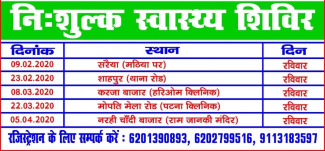 नीचे दिए हुए तिथियों को मुफ्त स्वास्थ्य शिविर लगाया जाएगा. 9 फरवरी वाला शिविर समाप्त हो चुका है. शेष 4 शिविर बचे हैं जो हर रविवार को आयोजित होंगे.