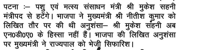 बिहार के पशुपालन एवं मत्स्य विभाग के मंत्री मुकेश सहनी की मंत्रिमंडल से छुट्टी तय हो गई है. मुख्यमंत्री नीतीश कुमार ने उन्हें हटाने के लिए राज्यपाल को सिफारिश कर दी है. मुख्यमंत्री सचिवालय से मिली जानकारी के मुताबिक भाजपा ने मुख्यमंत्री को यह स्पष्ट तौर पर लिख दिया था कि मुकेश साहनी अब एनडीए का हिस्सा नहीं हैं. इसके बाद मुख्यमंत्री ने राज्यपाल को सिफारिश भेजी है कि मुकेश सहनी को राज्यपाल बिहार मंत्रिमंडल से बाहर किया जाय.