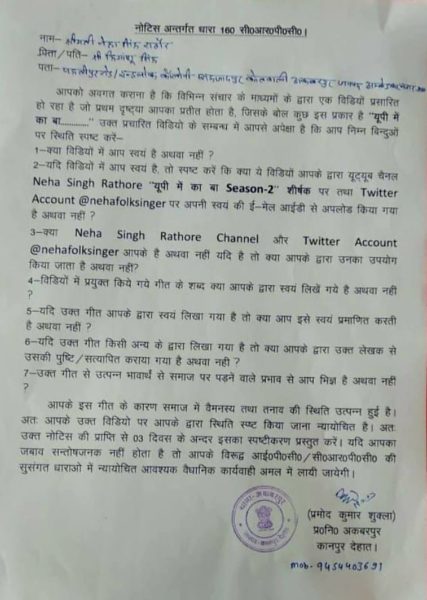 नेहा के गीतों के इस तंज पर पुलिस विभाग ने उन्हें घेरते हुए एक नोटिस जारी कर उनसे सात सवाल पूछा है. जिसमें तीन दिन के अंदर उनसे स्पष्टीकरण मांगा है. जारी नोटिस में भी पूछा गया है कि सोशल मीडिया के जिन प्लेटफार्म पर वे उक्त गीतों को पोस्ट करती हैं उन्हें वह खुद चलाती हैं या कोई और यह काम करता है.