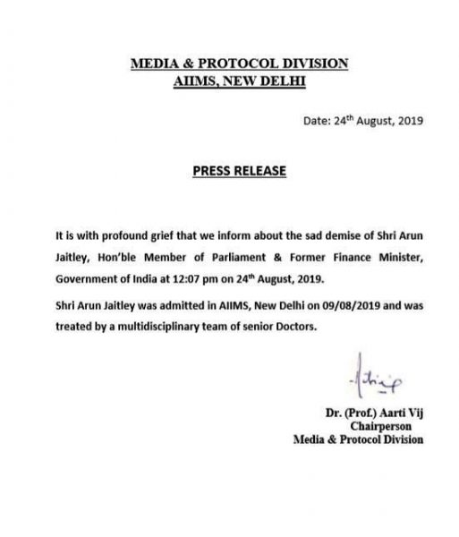 दिल्ली के एम्स की विज्ञप्ति के अनुसार उनका निधन दोपहर 12 बजकर 07 मिनट पर हुआ. जेटली के निधन की खबर सुनने के बाद गृह मंत्री अमित शाह ने अपने हैदराबाद दौरे को बीच में ही खत्म कर दिल्ली लौट गए.
