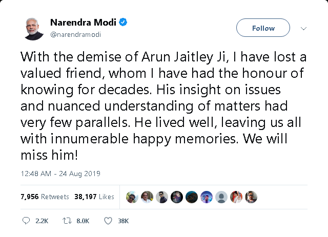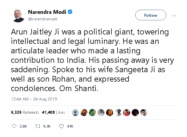 जेटली का निधन ऐसे वक्त में हुआ है जब प्रधानमंत्री नरेंद्र मोदी विदेश दौरे पर अभी संयुक्त अरब अमीरात (यूएई) में है. प्रधानमंत्री ने यूएई से ही जेटली की पत्नी संगीता और बेटे रोहन से बात की और उन्हें सांत्वना दी. मोदी ने ट्वीट में लिखा कि “जेटली एक करिश्माई व्यक्ति थे जिनका समाज के सभी वर्गों में बहुत सम्मान था। अपने लंबे राजनीतिक करियर में उन्होंने कई मंत्रालयों की जिम्मेदारी संभाली थी”.