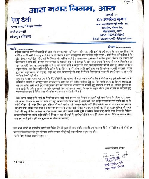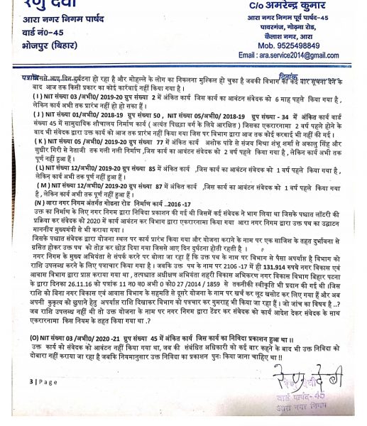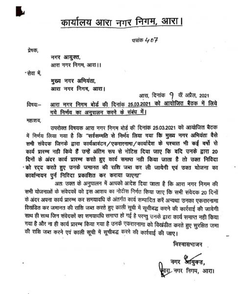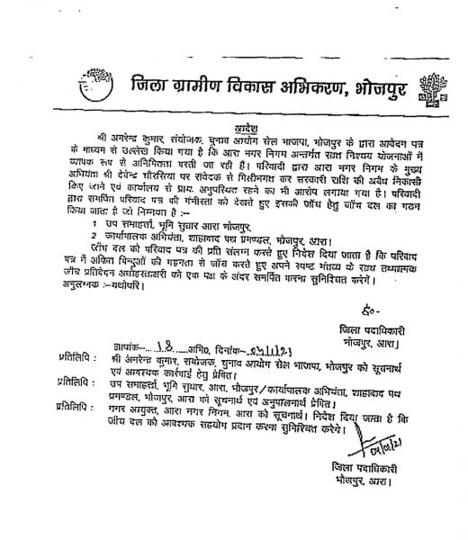 खैर परिणाम यह हुआ कि लगातार भारतीय जनता पार्टी चुनाव आयोग सेल के भोजपुर जिला संयोजक अमरेंद्र कुमार के द्वारा की जा रही शिकायतों के बाद जिलाधिकारी भोजपुर के द्वारा ज्ञापांक 18 अभी०, दिनांक-04/01/2021 के माध्यम से एक जांच कमेटी गठित की गई. जिसमें उप समाहर्ता, भूमि सुधार आरा, भोजपुर एवं कार्यपालक अभियंता, शाहाबाद पथ प्रमंडल, भोजपुर, आरा को जांच की जिम्मेदारी दी गई. लेकिन डीएम के आदेश की अवहेलना करते हुए इन दोनों पदाधिकारियों के द्वारा आज तक जांच नहीं की गई. जिसके कुछ समय बाद आरा नगर निगम के नगर आयुक्त ने 9 अप्रैल, 2021 को पत्रांक 407 के जरिये मुख्य नगर अभियंता,आरा नगर निगम को एक आदेश निर्गत करते हुए आदेश दिया कि वैसे सभी संवेदक जिनके द्वारा कार्य आवंटन / एकरारनामा / कार्यादेश के पश्चात भी कई वर्षों से कार्य प्रारम्भ नही किये हैं, उन्हें अंतिम रूप से नोटिस दिया जाए. यदि इस नोटिस के बाद भी उनके द्वारा 20 दिनों के अंदर कार्य प्रारम्भ करते हुए कार्य समाप्त नही किया जाता है तो उक्त निविदा को रद्द करते हुए उनके जमानत की राशि भी जब्त कर ली जाय एवं उक्त योजना का कार्यान्वयन पुर्न निविदा प्रकाशित कर की जाए.
