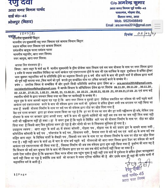 दर्जनों पत्राचार इलेक्ट्रॉनिक व भारतीय डाक के माध्यम से किये गए. इसकी बानगी जरा एक ईमेल से समझते हैं जिसमें वार्ड पार्षद रेणु देवी तथा उनके प्रतिनिधि सह पूर्व वार्ड पार्षद अमरेंद्र कुमार ने लिखा है कि ईमेल id:- [email protected], [email protected] से प्रमंडलीय आयुक्त के ऑफिसियल ईमेल ID पर दिनांक 06.11.20 09.11.20 30.11.20 03.12.20, 27.01.21, 1.02.21, 06.02, 21, 11.02.21, 18.02.21, 26.02.21, 02.03.21, 07.03.21, और 17.03.21 को 13 बार मेल के जरिये शिकायत भेजा. यहाँ तक की लोक शिकायत निवारण समिति को भी शिकायत भेजी गयी. लगातार शिकायतों के बाद अमरेंद्र कुमार व वार्ड पार्षद रेनू देवी को धमकियाँ भी मिलीं. उन्हें यह कहा गया कि जितनी शिकायत करोगे, उतना ही देर से काम होगा क्योंकि भ्रष्टाचार के इस खेल में सभी संलिप्त हैं.