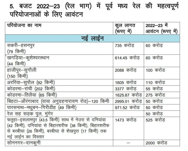 - बजट 2022 – 23 में पूर्व मध्य रेल को कुछ प्रमुख मदों हेतु आवंटित राशि