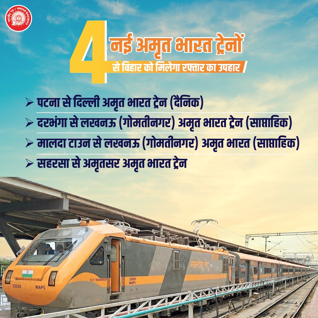 तथा सहरसा और अमृतसर के मध्य अमृत भारत ट्रेन शामिल हैं. इसके साथ ही सीमांचल से दक्षिण भारत के लिए एक नई ट्रेन जो जोगबनी से इरोड के मध्य चलायी जाएगी.