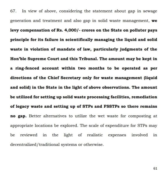 इस राशि का इस्तेमाल ठोस कचरा निस्तारण सुविधाओं की स्थापना, पुराने कचरे के उपचार और सीवेज ट्रीटमेंट संयंत्रों के निर्माण के लिए किया जाएगा. एनजीटी ने उल्लेख किया कि बिहार पर 11.74 लाख मीट्रिक टन से अधिक पुराने कचरे के साथ प्रति दिन निकलने वाले 4,072 मीट्रिक टन अशोधित शहरी कचरे के प्रबंधन का बोझ है. NGT ने कहा कि बिहार में तरल अपशिष्ट उत्पादन और उपचार में 219.3 करोड़ लीटर प्रति दिन का अंतर है. एनजीटी ने स्पष्ट लिखा है कि सुप्रीम कोर्ट और एनजीटी के पुराने आदेश की अवहेलना की वजह से बिहार सरकार पर पर्यावरण क्षतिपूर्ति शुल्क लगाया जा रहा है. हर 6 महीने पर बिहार के चीफ सेक्रेटरी को बिहार में कचरा प्रबंधन के तहत हो रहे कार्यों की रिपोर्ट एनजीटी को देनी होगी. इधर 1 जून 2023 से हर महीने मासिक रिव्यू की राज्य स्तरीय मॉनिटरिंग चीफ सेक्रेटरी जबकि डीएम जिला स्तरीय मॉनिटरिंग करेंगे.