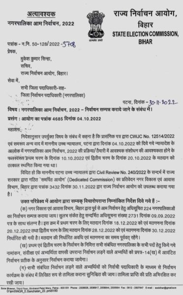पटना।। इस वक्त की बड़ी खबर निर्वाचन आयोग बिहार से आ रही है. निर्वाचन आयोग ने बिहार में दो चरणों में इसी महीने नगर निकाय चुनाव कराने की घोषणा कर दी है. बिहार निर्वाचन आयोग के मुताबिक नगर विकास एवं आवास विभाग, बिहार द्वारा पूर्व से आम निर्वाचन हेतु अधिसूचित 224 नगरपालिकाओं का निर्वाचन सम्पन्न कराया जाय. इस क्रम में प्रथम चरण के लिए मतदान दिनांक 18.12.2022 को एवं मतगणना दिनांक 20.12.2022 तथा द्वितीय चरण के लिए मतदान दिनांक 28.12.2022 को एवं मतगणना दिनांक 30.12.2022 निर्धारित की गयी है. मतदान की निर्धारित अवधि एवं मतगणना का समय पूर्ववत् रहेंगे. प्रथम एवं द्वितीय चरण के निर्वाचन के निमित्त सभी संबंधित नगरपालिका के सभी पदों के लिए किये गये है.
