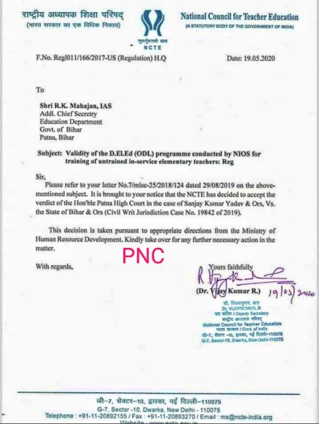 एनआईओएस से डिप्लोमा इन एलीमेंट्री एजुकेशन का सर्टिफिकेट लेने वाले शिक्षकों के लिए 20 मई का दिन यादगार हो गया. पिछले साल शिक्षा विभाग को एनसीटीई ने एक पत्र भेजकर इन शिक्षकों के भविष्य पर सवाल खड़े कर दिए थे. तबसे बिहार के निजी स्कूलों के करीब ढाई लाख शिक्षक हर दिन शिक्षा विभाग और एनसीटीई के बीच बने हुए थे. आखिरकार अब एनसीटीई ने इन्हें केंद्र सरकार के हस्तक्षेप पर ‘पूर्ण शिक्षक’ का दर्जा दे दिया है.