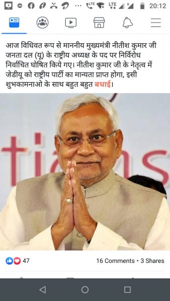 बिहार के मुख्यमंत्री नीतीश कुमार एक बार फिर जनता दल यूनाइटेड के राष्ट्रीय अध्यक्ष चुने गए. नीतीश कुमार निर्विरोध पार्टी के अध्यक्ष निर्वाचित किए गए हैं।
