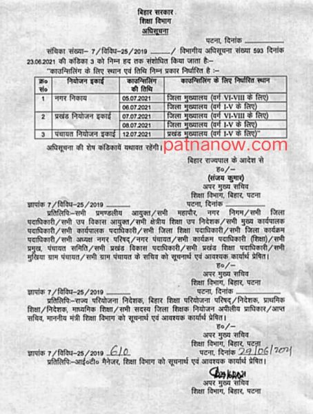 बिहार में प्राथमिक शिक्षक नियोजन के लिए शिक्षा विभाग ने अब नया शेड्यूल जारी कर दिया है. जुलाई महीने में बिहार के उन नगर निकाय, प्रखंड और पंचायत नियोजन इकाइयों में काउंसलिंग की घोषणा की गई है जहां दिव्यांग अभ्यर्थियों के आवेदन नहीं आए हैं. पहले शिक्षा विभाग ने जो शेड्यूल जारी किया था उसके मुताबिक 5 जुलाई को नगर निकाय 7 जुलाई को प्रखंड नियोजन इकाई और 12 जुलाई को पंचायत नियोजन इकाई में काउंसलिंग की घोषणा की गई थी. अब इसमें बदलाव करते हुए शिक्षा विभाग ने नया शेड्यूल जारी किया है.
