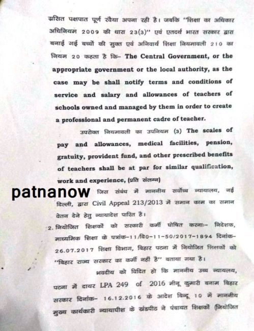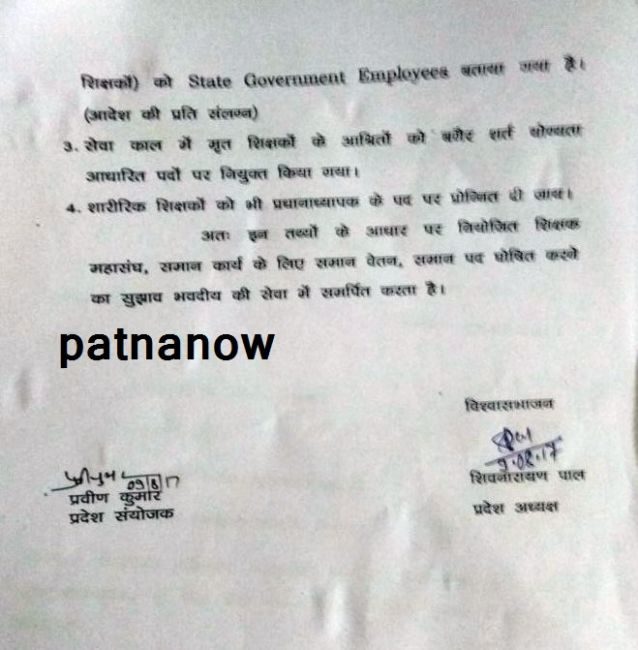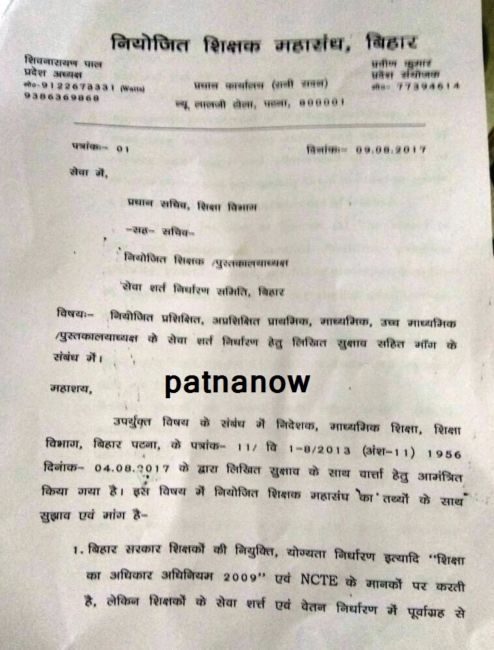 आज कमिटी से सभी 12 संघों के प्रतिनिधियों ने मुलाकात की और उनके समक्ष अपनी मांगें लिखित रुप में रखीं. इनमें से एक बिहार नियोजित शिक्षक महासंघ के प्रदेश अध्यक्ष शिव नारायण पाल ने बताया कि गृह सचिव आमिर सुबहानी और शिक्षा विभाग के प्रधान सचिव आर के महाजन के सामने उनलोगों ने अपनी मांगें रखी हैं और इसे जल्द से जल्द लागू करने की मांग की है.