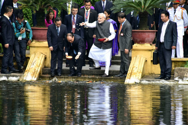 नरेन्द्र मोदी वियतनाम के राष्ट्रपति भवन में मछलियों को चारा खिलाते हुए