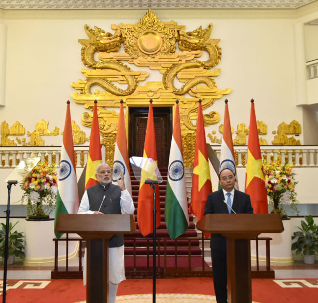 प्रधानमंत्री नरेन्द्र मोदी वियतनाम की यात्रा पर है इस अवसर पर हनोई वियतनाम में राष्ट्रपति भवन में उनका भव्य स्वागत किया गया.इस दौरान वियतनाम के प्रधानमंत्री Nguyen Xuan Phuk भी मौजूद थे.नरेंद्र मोदी की वियतनाम यात्रा के पहले दिन दोनों देशों के बीच डिफेंस और आईटी समेत कई अन्य महत्वपूर्ण मामलों में सहयोग को लेकर समझौतों पर हस्ताक्षर कर दिए गए.पिछले 15 सालों में इस देश की यात्रा करने वाले पहले भारतीय प्रधानमंत्री नरेंद्र मोदी का स्वागत वियतनाम के राष्ट्रपति त्रान दाई क्वांत ने किया.
