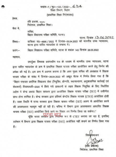 प्राथमिक शिक्षा निदेशक रवि प्रकाश ने बिहार विद्यालय परीक्षा समिति को स्पष्ट किया है कि अपर मुख्य सचिव की अध्यक्षता में शिक्षक पात्रता परीक्षा के संबंध में दिनांक 26.04.2022 को आहूत बैठक में निर्णय लिया गया है कि “बिहार पंचायत प्रारंभिक विद्यालय सेवा (नियुक्ति, प्रोन्नति, स्थानान्तरण, अनुशासनिक कार्रवाई एवं सेवाशर्त) नियमावली – 2020 में किये गये प्रावधानों के तहत शिक्षक नियुक्ति के लिए निर्धारित अर्हता में केन्द्र अथवा बिहार सरकार द्वारा आयोजित शिक्षक पात्रता परीक्षा (TET) में उत्तीर्णता प्राप्त होना शामिल है. केन्द्र सरकार द्वारा प्रतिवर्ष केन्द्रीय शिक्षक पात्रता (CTET) आयोजित होती है. उक्त स्थिति में राज्य सरकार द्वारा शिक्षक पात्रता परीक्षा (TET) अलग से आयोजित करने की आवश्यकता महसूस नहीं हो रही है. भविष्य में विभाग द्वारा आवश्यकता आधारित शिक्षक पात्रता परीक्षा (TET) आयोजित किये जाने पर विचार कर निर्णय लिया जा सकेगा.” चूँकि भारत सरकार द्वारा नियमित रूप से CTET कराया जा रहा है, इसलिए वर्त्तमान में विभाग द्वारा शिक्षक पात्रता परीक्षा (TET) आयोजित नहीं कराने का निर्णय लिया गया है.